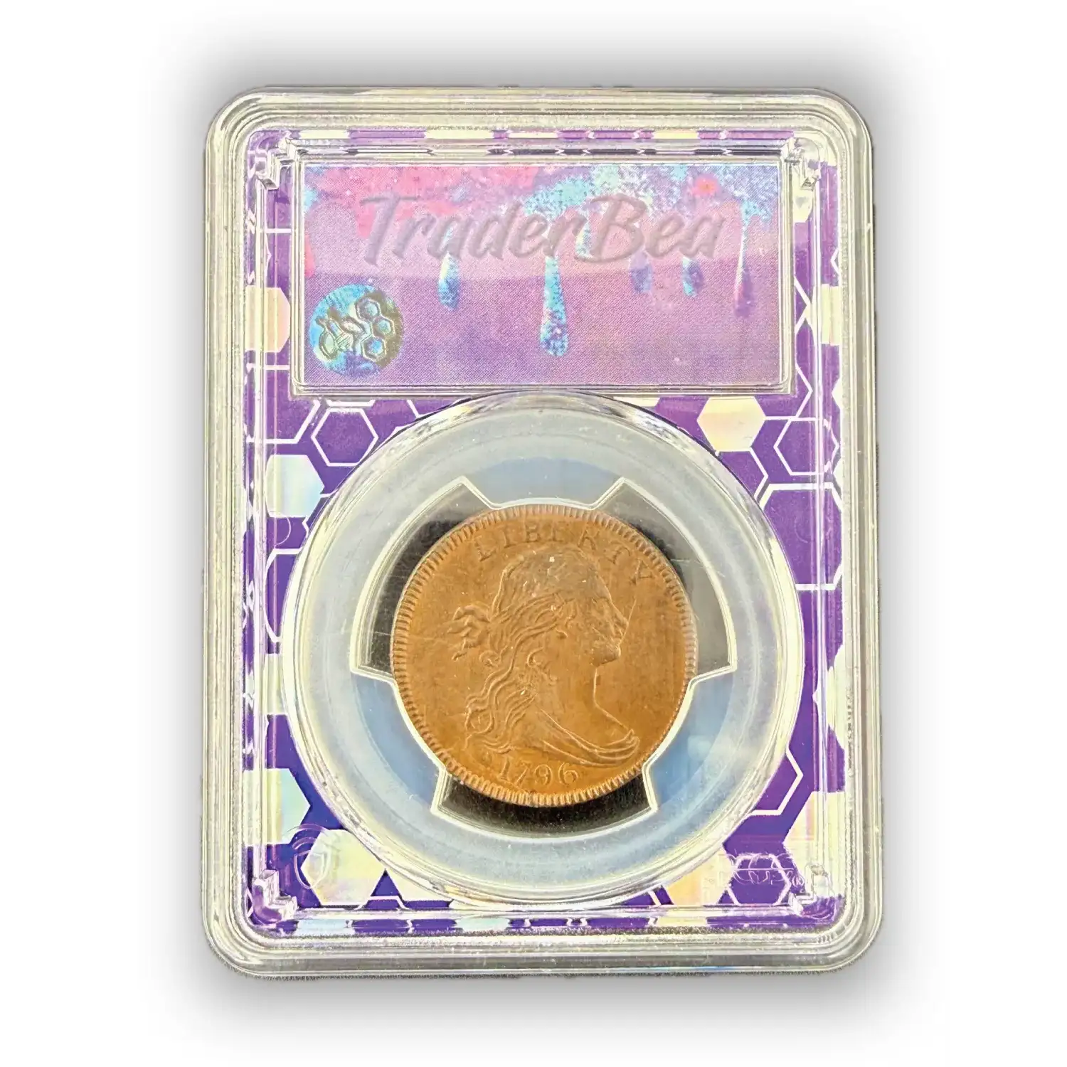 This 1796 Draped Bust Large Cent is a remarkable early American copper coin, graded MS-61 Brown by PCGS. Featuring the desirable Reverse of 1797, this coin represents one of the earliest years of U.S. Mint large cent production. Housed in a distinctive purple core Trader Bea slab, it offers a unique blend of historic significance and modern collectible presentation.