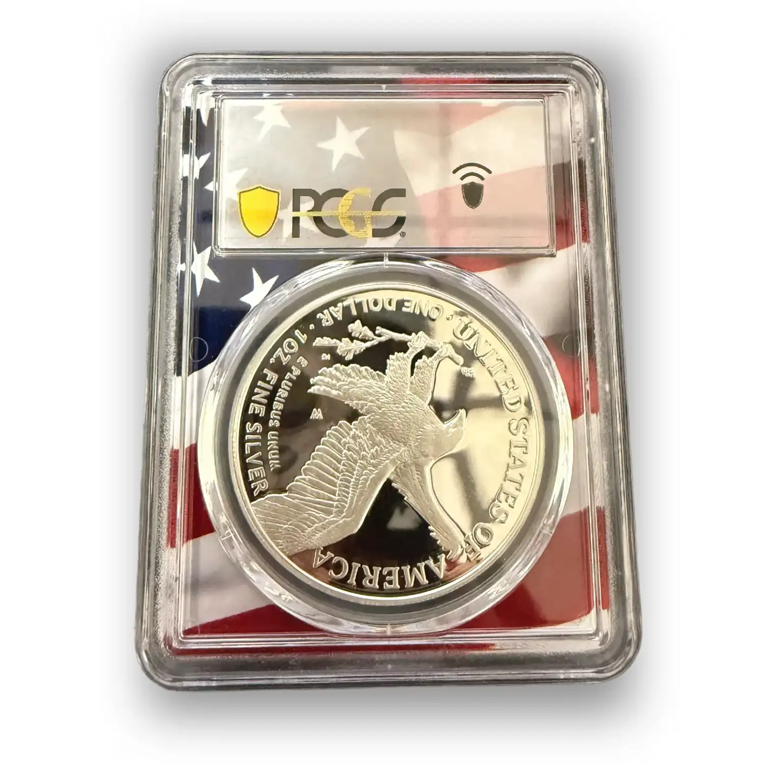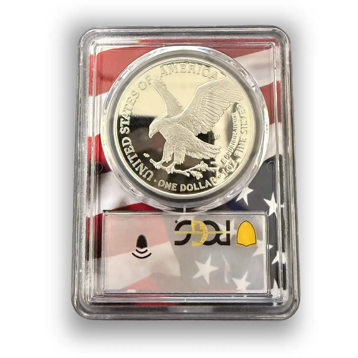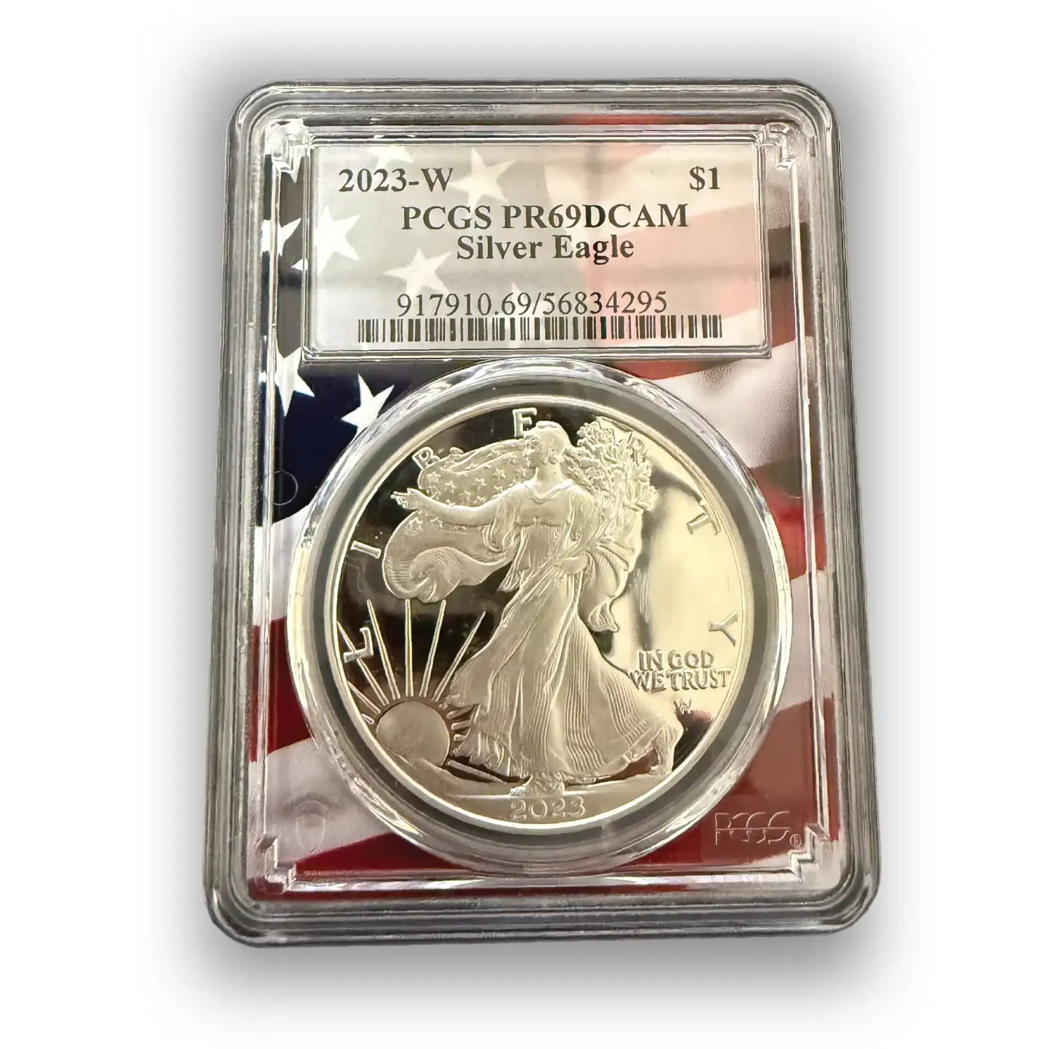 The 2023-W Proof American Silver Eagle contains 1 oz of .999 fine silver and showcases one of the most iconic designs in U.S. coinage. Graded PR-69 Deep Cameo by PCGS, this near-perfect example features exceptional contrast between frosted devices and mirrored fields. Encased in a striking American Flag-themed slab, it offers added visual appeal for collectors.