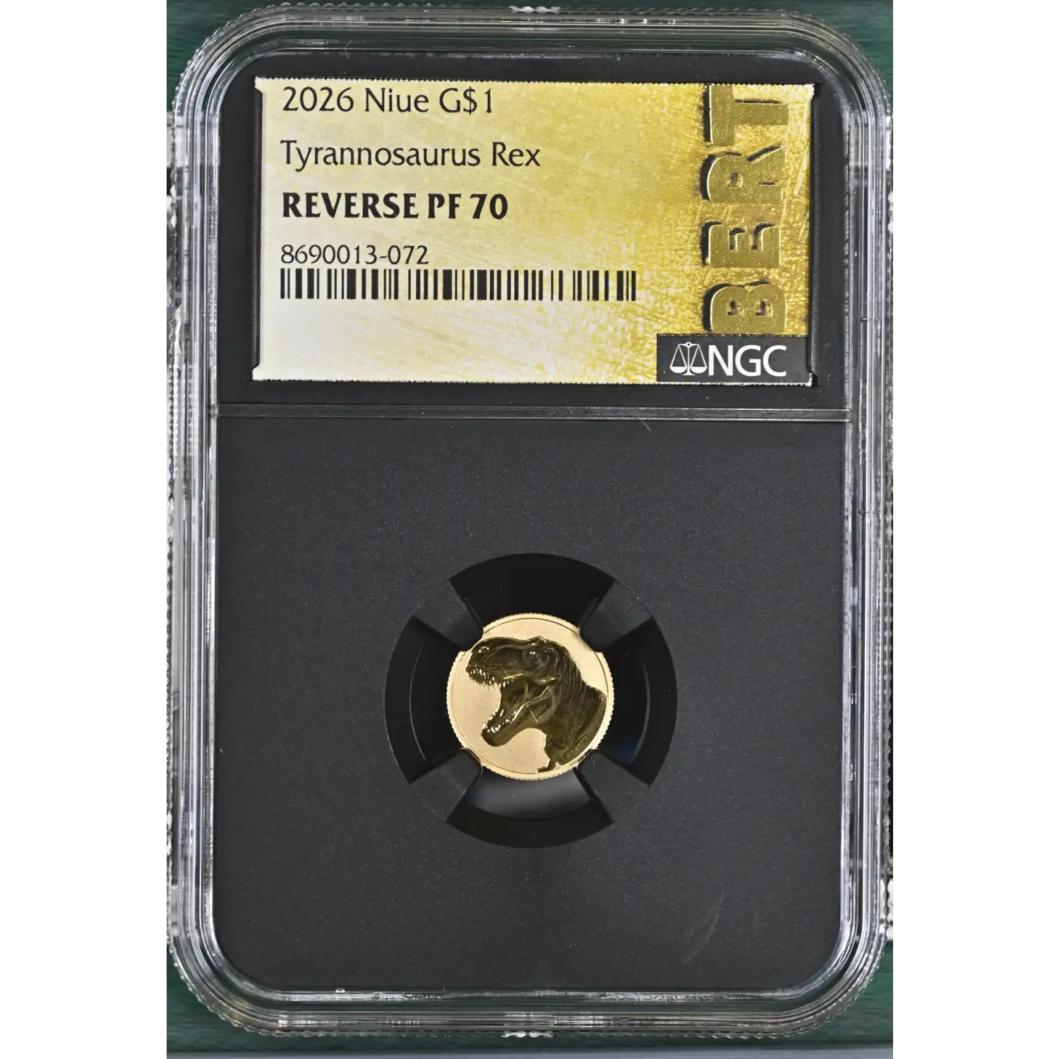 The 2026 Niue Tyrannosaurus Rex 1 Gram Gold Coin delivers a powerful tribute to one of the most iconic predators of the prehistoric world. Struck in gold with a stunning reverse proof finish and certified a perfect PF-70 by NGC, this piece combines exceptional quality with bold, eye-catching design. Housed in a Trader Bea holder with the distinctive BERT label, it offers added collectible appeal for modern numismatists.