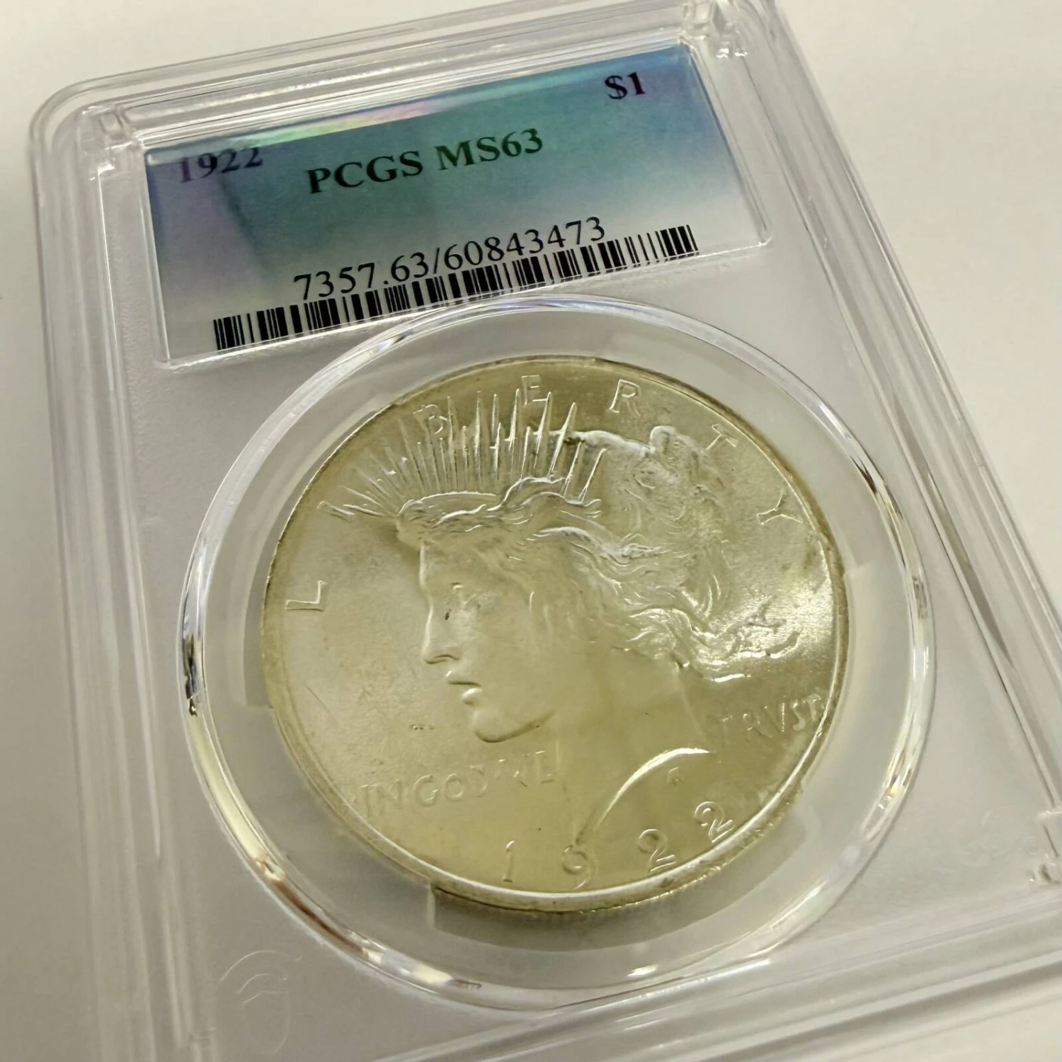 This 1922 Peace Silver Dollar, struck at the Philadelphia Mint, is graded MS-63 by PCGS and features strong luster with pleasing overall eye appeal. As an early issue in the iconic Peace Dollar series, it represents a meaningful era of post-World War I optimism in American coinage.