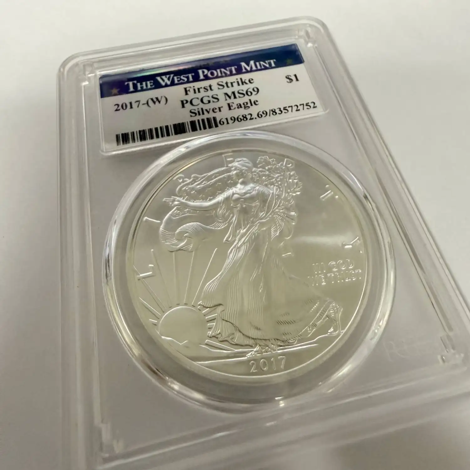 This 2017-W American Silver Eagle contains 1 oz of .999 fine silver and is certified MS-69 First Strike by PCGS. Struck at the West Point Mint, this near-perfect coin offers strong eye appeal and added collectible appeal from its First Strike designation.