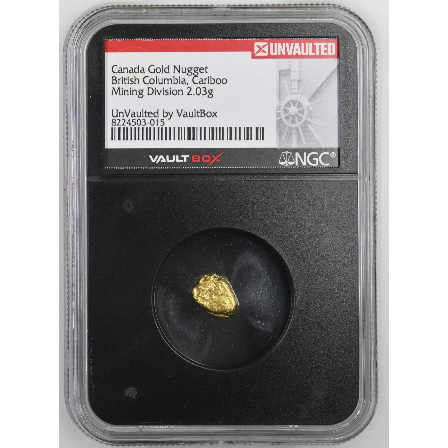 This 2.03 gram natural gold nugget originates from the historic Cariboo Mining Division of British Columbia. Certified by NGC and housed in an “Unvaulted” VaultBox slab, this piece combines authentic geological origin with modern collectible presentation.