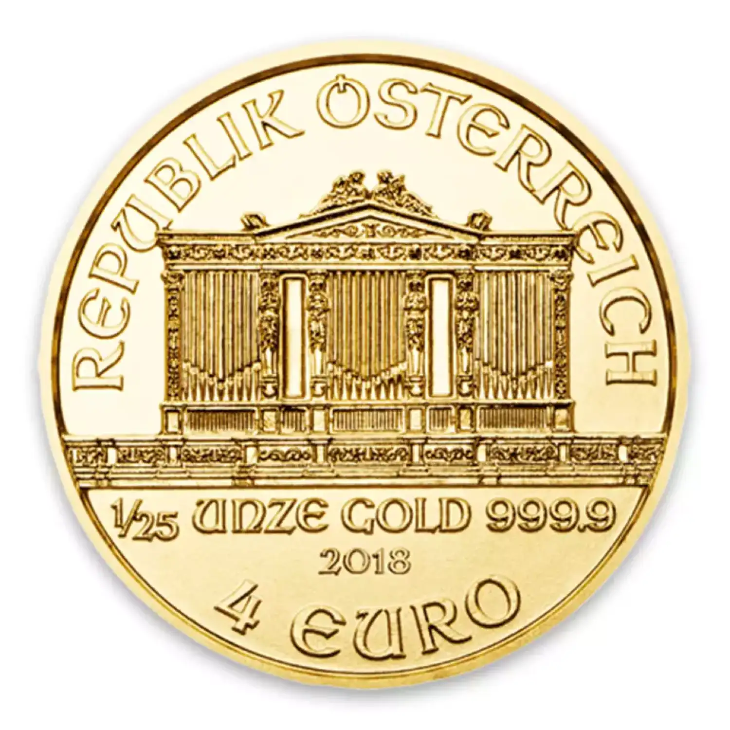 The 1/25 oz Austrian Gold Philharmonic is a classically styled .9999 fine gold coin, backed by Austria. This series of gold coin is highly popular among investors and collectors. The 1/25 oz Austrian Gold Philharmonic coin contain 0.04 oz of gold. The Reverse of the 1/25 oz Austrian Philharmonic gold coin features an array of instruments, including the cello, violin, harp, Vienna horn and bassoon.