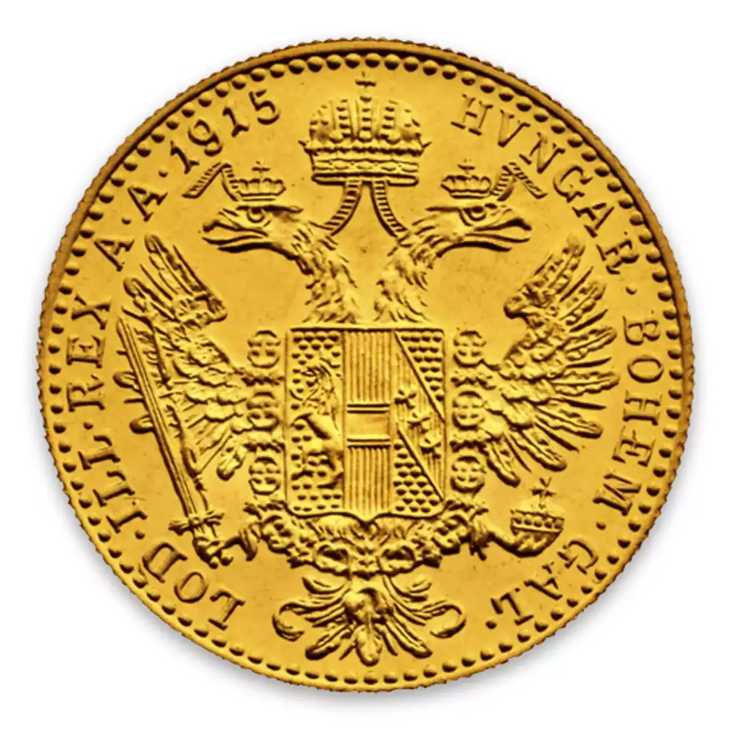 Ducat re-strikes are available with a face value of 1 or 4 ducats. The reverse side of Modern Re-strikes 1 Ducat Coins features the Austro-Hungarian Empire’s coat of arms. The obverse displays a young effigy of Franz Joseph I.