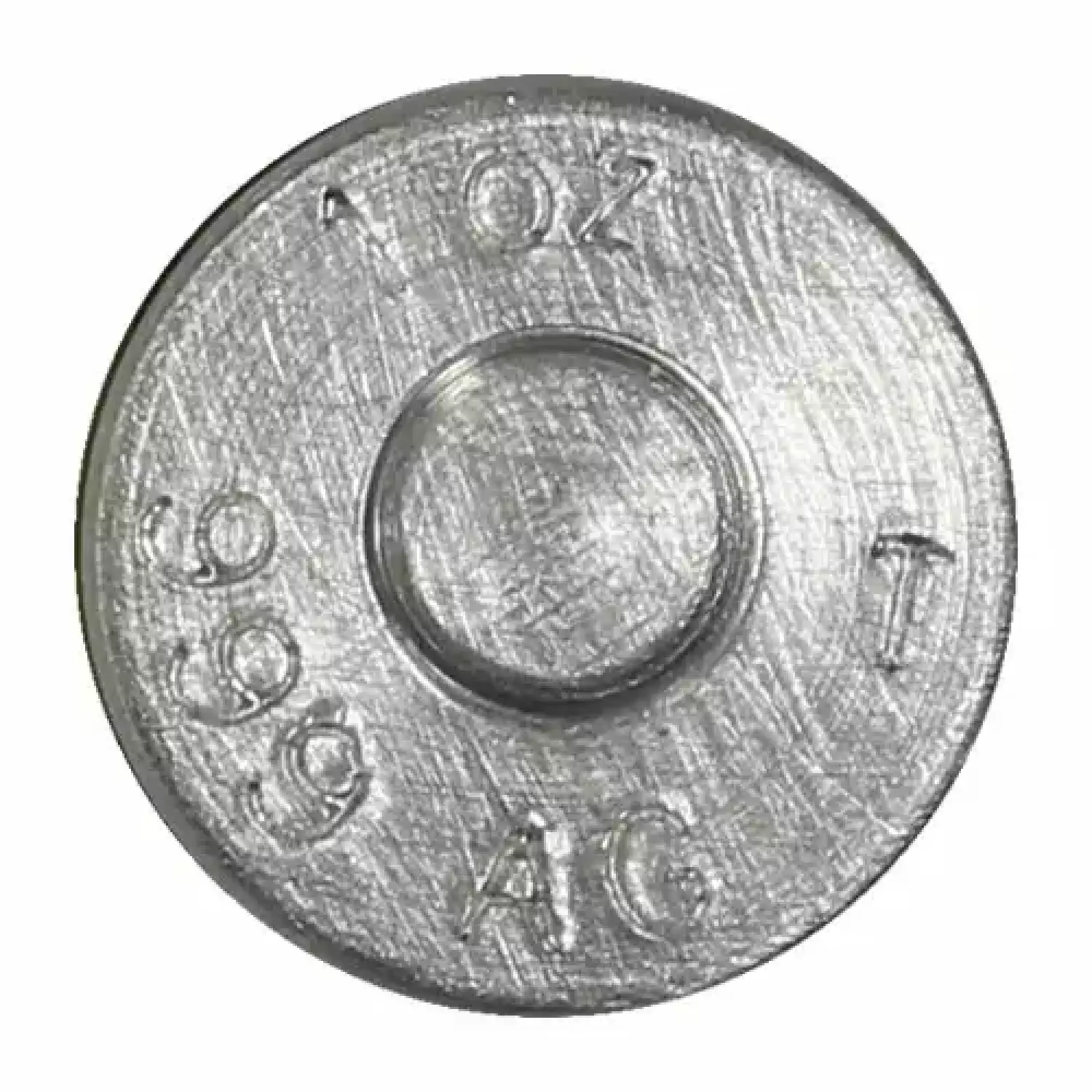If you look at these 1 oz Silver Bullet .45 Caliber products, youll notice a lack of imagery and markings. The products sole visual is an appearance similar to that of a real ammo round. Look at the bottom of the .45 caliber round and youll find engravings of the weight, purity, and metal content.