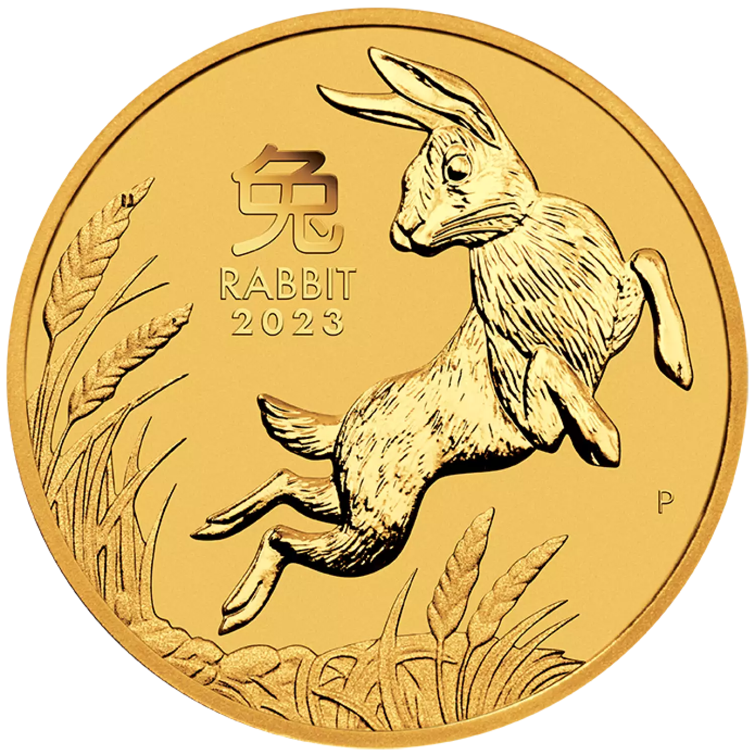 The lunar series from the Perth Mint is appealing to investors and collectors alike. Innovative designs, high quality minting and exceptional purity make these coins stand out from other bullion coins in the industry. The 2023 ½ oz Australian Perth Mint Gold Lunar III: Year of the Rabbit is composed of 1/2 oz of .9999 pure gold and has a face value of 50 AUD.The Obverse of the coin features Queen Elizabeth II as the coin was designed and started minting just before her death earlier this year. The reverse of this years coin features two rabbits beneath a bush. One sitting peacefully while the other gold rabbit is standing on its hind legs appearing to reach for berries on the bush above.